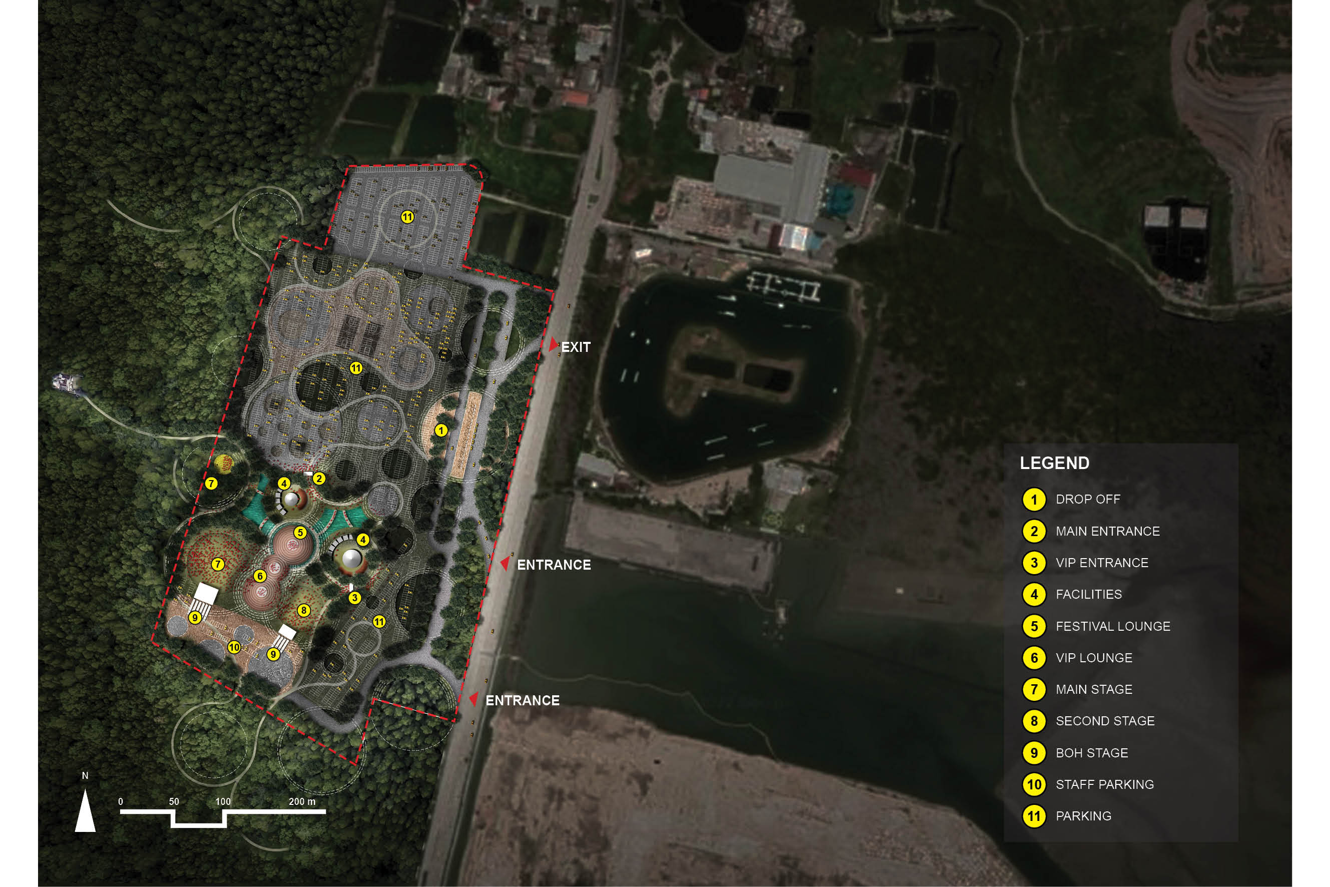 The Benoa Forest Festival embodies three main concepts: vertical elements, nature interventions, and organic form. Vertical elements are strategically installed throughout the venue, their tall silhouettes peeking above the tree canopies to ignite curiosity and entice people to come partake in the park's allure. Pre-existing mangrove forest is seamlessly integrated into the site to appear as an intrinsic part of the park, leading people in by taking them on a journey through the meticulously crafted landscape design inspired by the organic shapes that manifest in mangrove forests.