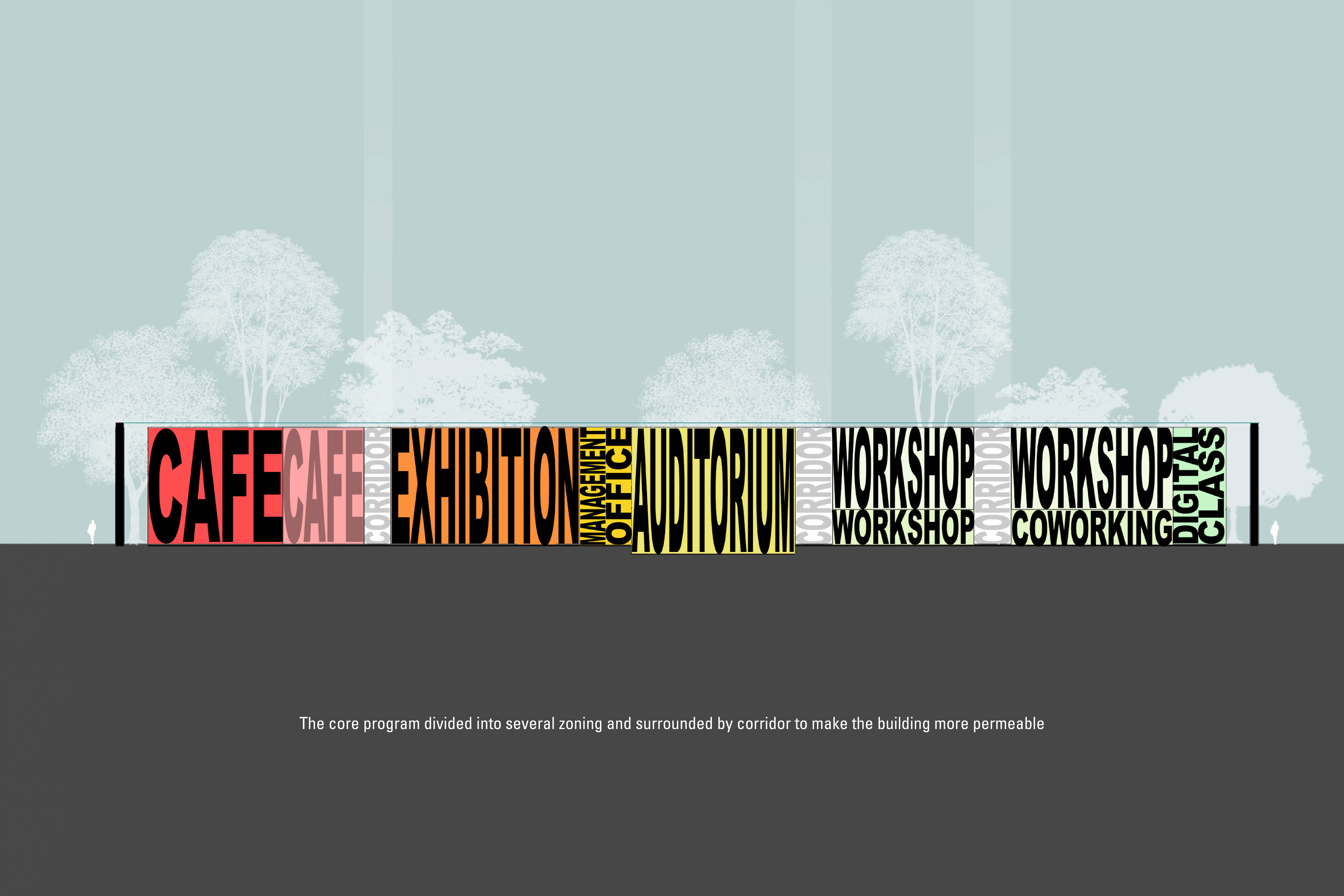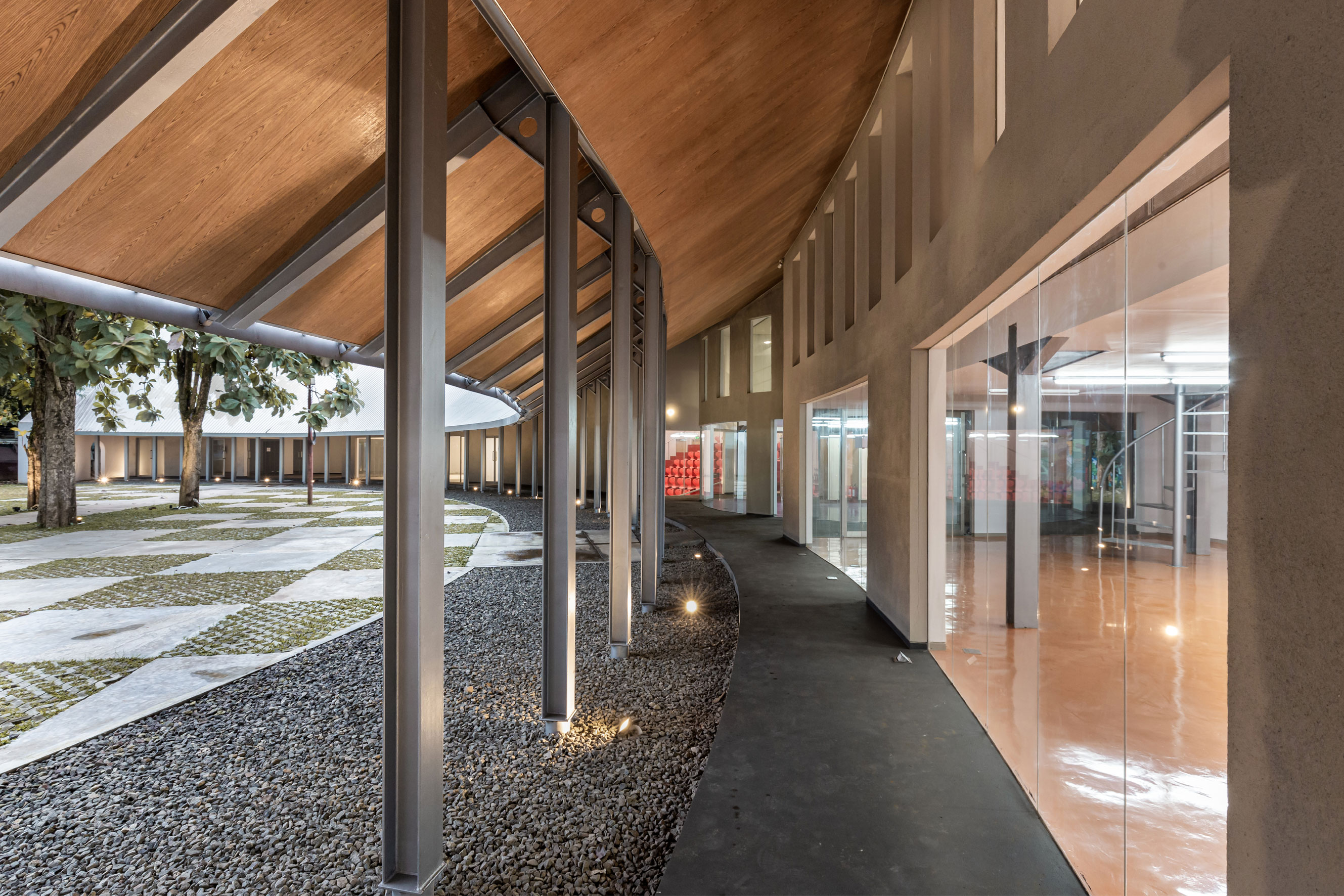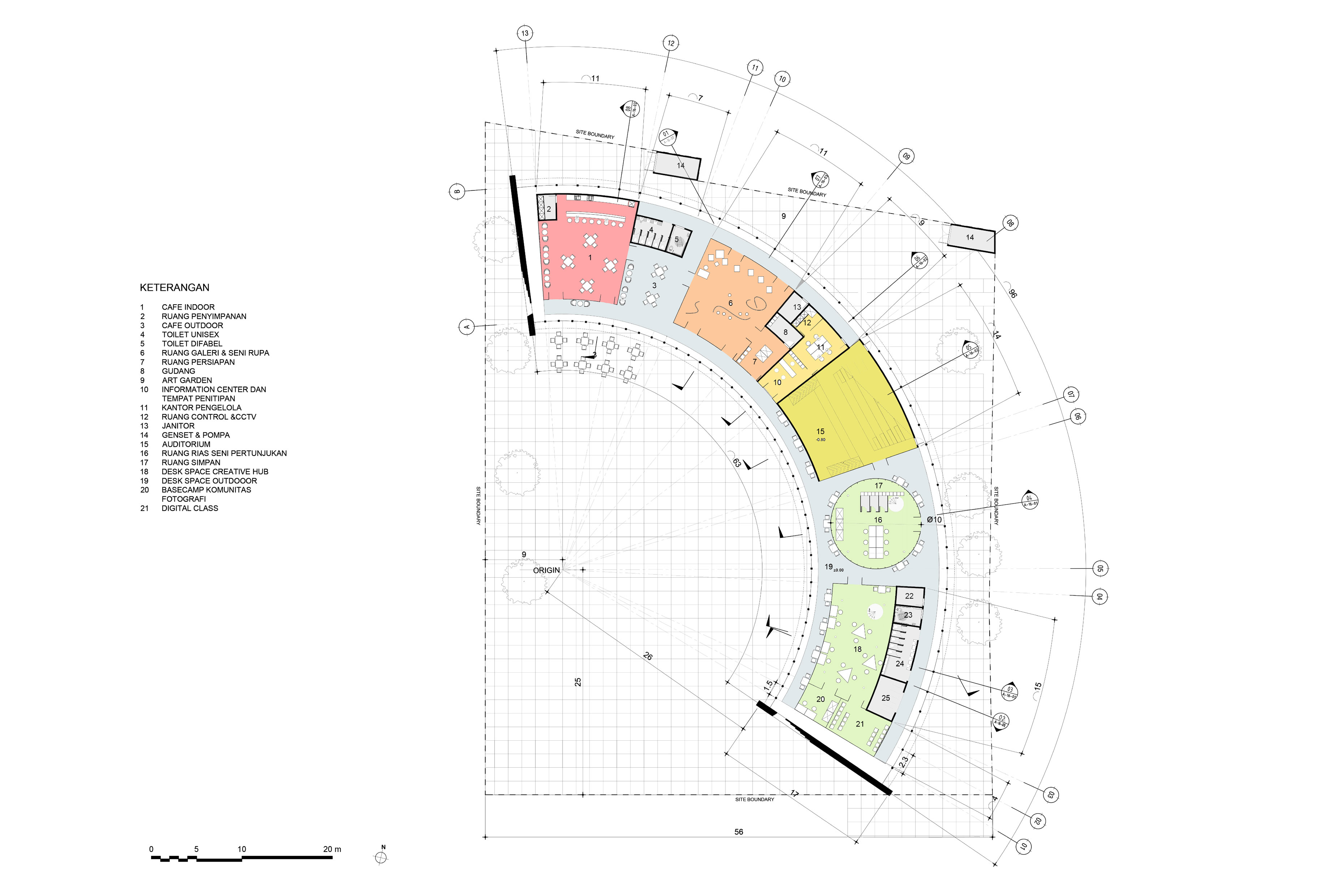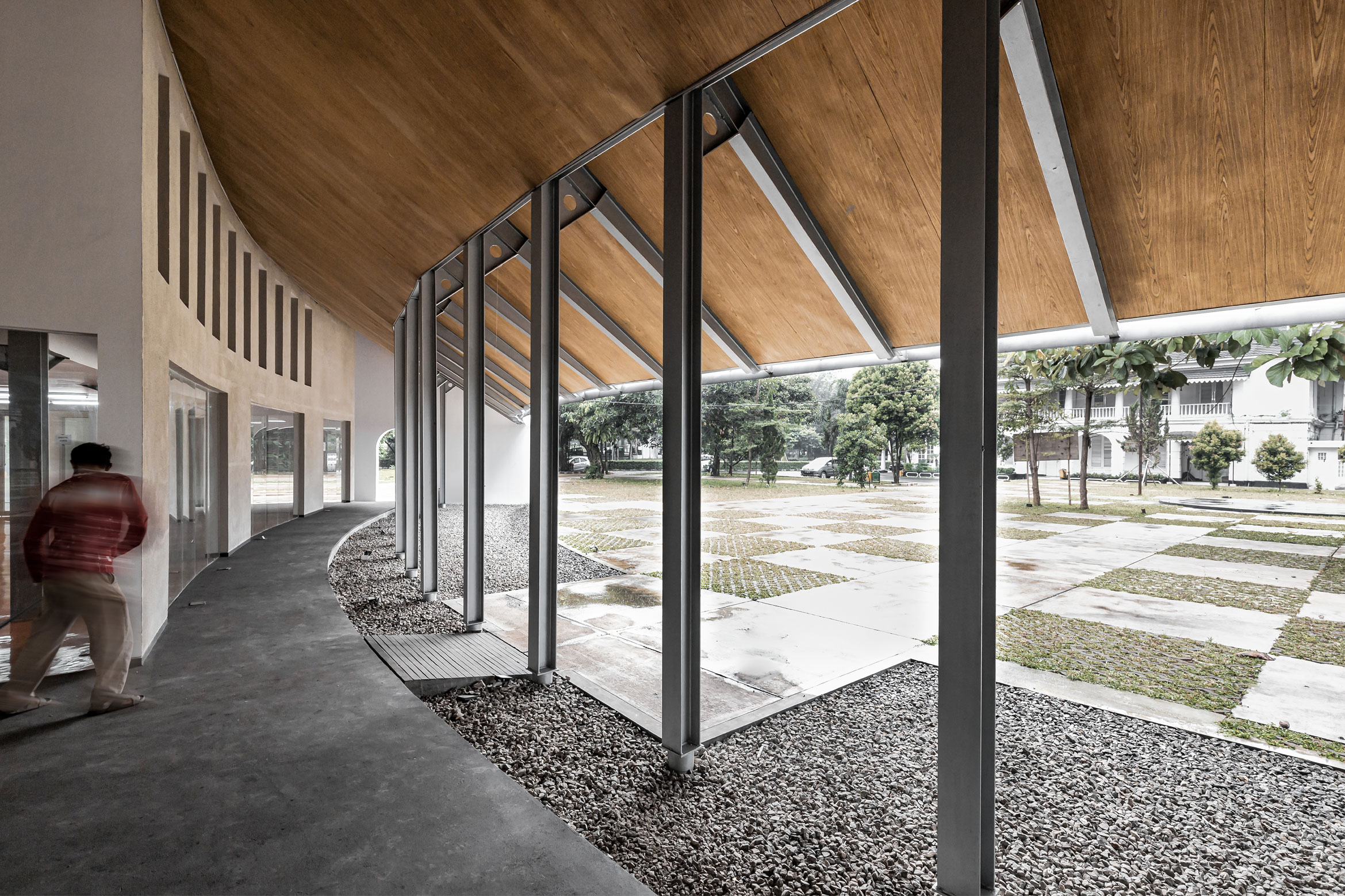Designed as generator for creative people in Bogor, this creative hub aims as a collective space of activities that acts as an open platform for exchange, spontaneous, informal exercise & inspiring spaces. This building stands in 1.3 Ha land with 200 years old existing building built by Dutch colonial time, leaves an open space that can be utilized as casual and extension activity. This complex extends to larger neighborhood of Taman Hutan Raya Bogor of the Presidential Palace of Indonesia, making it very prominent yet carefully thoughtful in design language. The Creative hub is conceived as a single building, with porous accessibility from all directions, smoothly connecting all open space in the complex for open-air activities & extends to the park. The C form is organized by facing existing big trees & old buildings like it’s covering & filling out the edge of the complex. The programs inside (auditorium – classrooms – Gallery) occupy different geometries under a single curvy roof that reflects as a dominant expression of tropical design. All programs are surrounded by open terraces that enlarge the space as communal space and accessibility. The experience throughout the building takes visitors to repetitive columns, combining terraces within the inside-out area to the park. The sensation of covered open space continues through the terrace, providing an inclusive environment between education, leisure & outdoor performance. The building itself leaves room within the scheme, such as outdoor plaza to historical building, and to breed creativity through a social, informal space and dedicated programs.