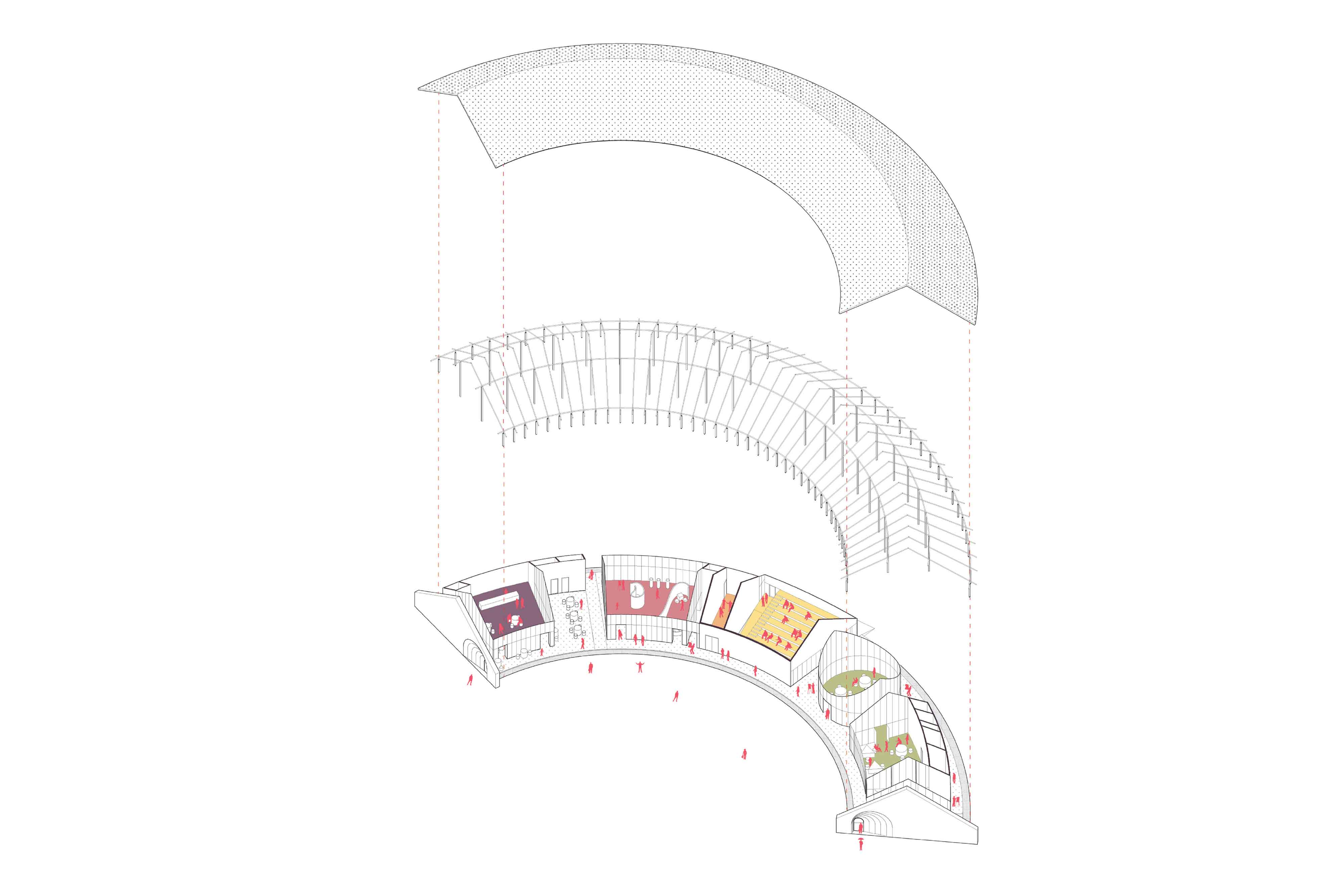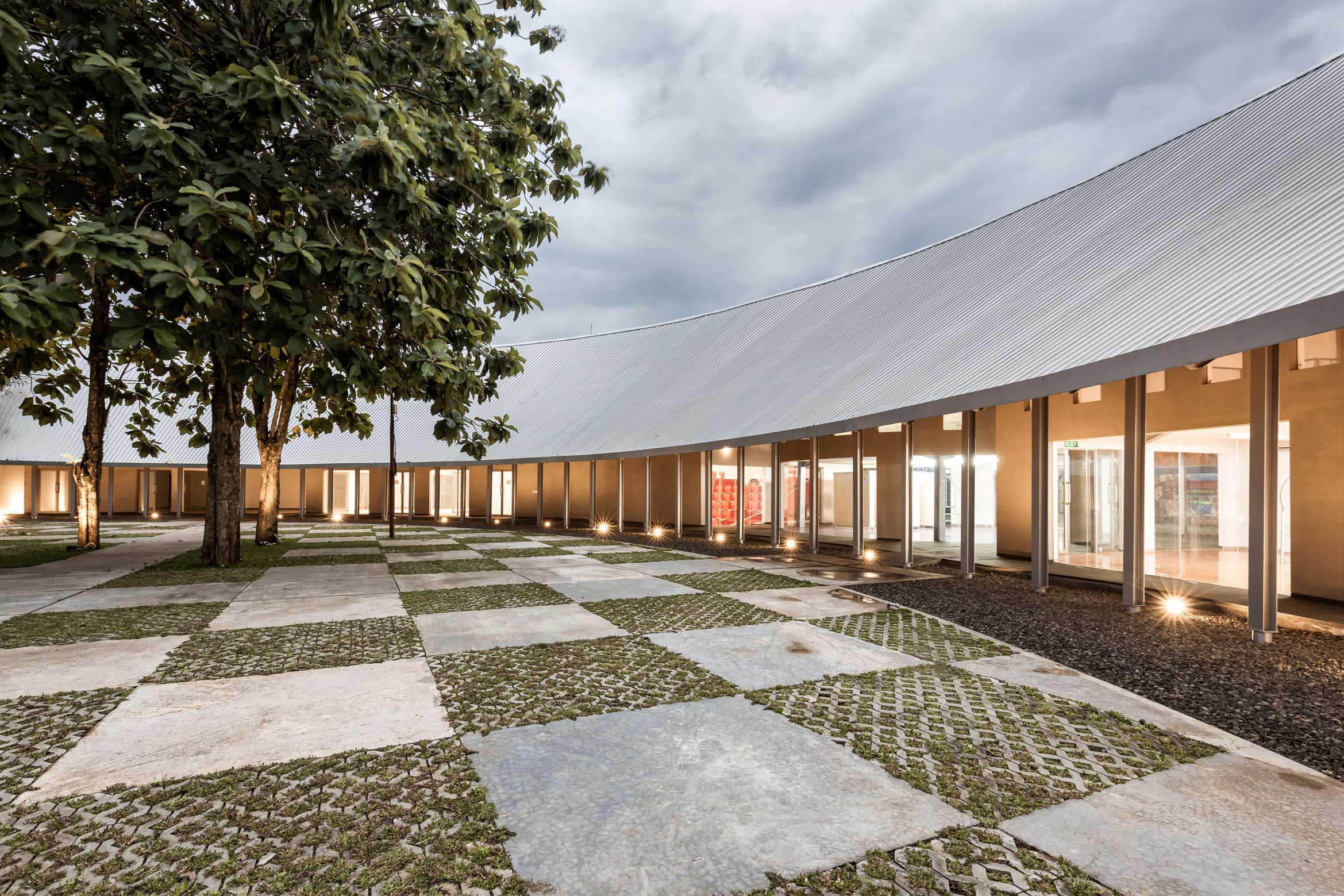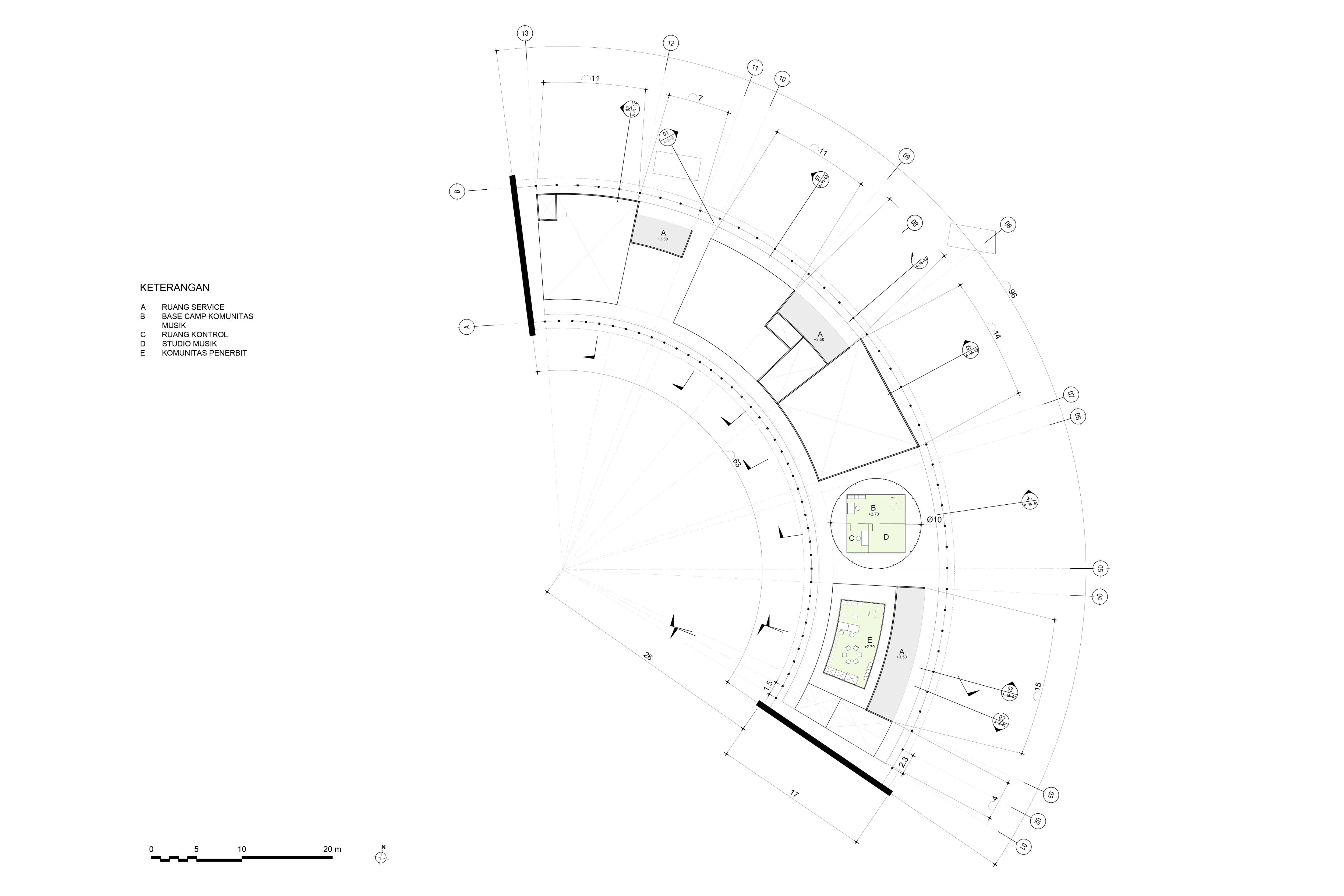 Designed as generator for creative people in Bogor, this creative hub aims as a collective space of activities that acts as an open platform for exchange, spontaneous, informal exercise & inspiring spaces. This building stands in 1.3 Ha land with 200 years old existing building built by Dutch colonial time, leaves an open space that can be utilized as casual and extension activity. This complex extends to larger neighborhood of Taman Hutan Raya Bogor of the Presidential Palace of Indonesia, making it very prominent yet carefully thoughtful in design language. The Creative hub is conceived as a single building, with porous accessibility from all directions, smoothly connecting all open space in the complex for open-air activities & extends to the park. The C form is organized by facing existing big trees & old buildings like it’s covering & filling out the edge of the complex. The programs inside (auditorium – classrooms – Gallery) occupy different geometries under a single curvy roof that reflects as a dominant expression of tropical design. All programs are surrounded by open terraces that enlarge the space as communal space and accessibility. The experience throughout the building takes visitors to repetitive columns, combining terraces within the inside-out area to the park. The sensation of covered open space continues through the terrace, providing an inclusive environment between education, leisure & outdoor performance. The building itself leaves room within the scheme, such as outdoor plaza to historical building, and to breed creativity through a social, informal space and dedicated programs.