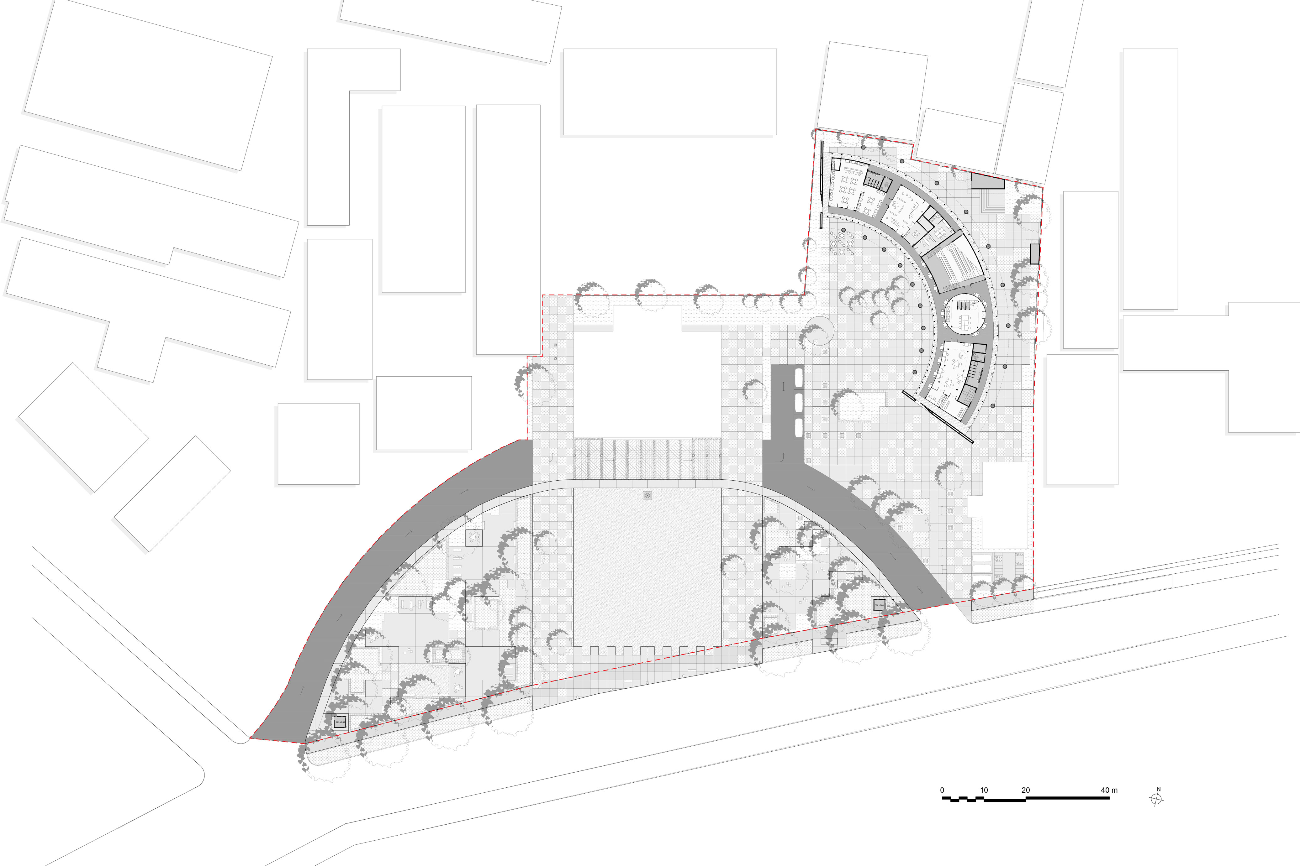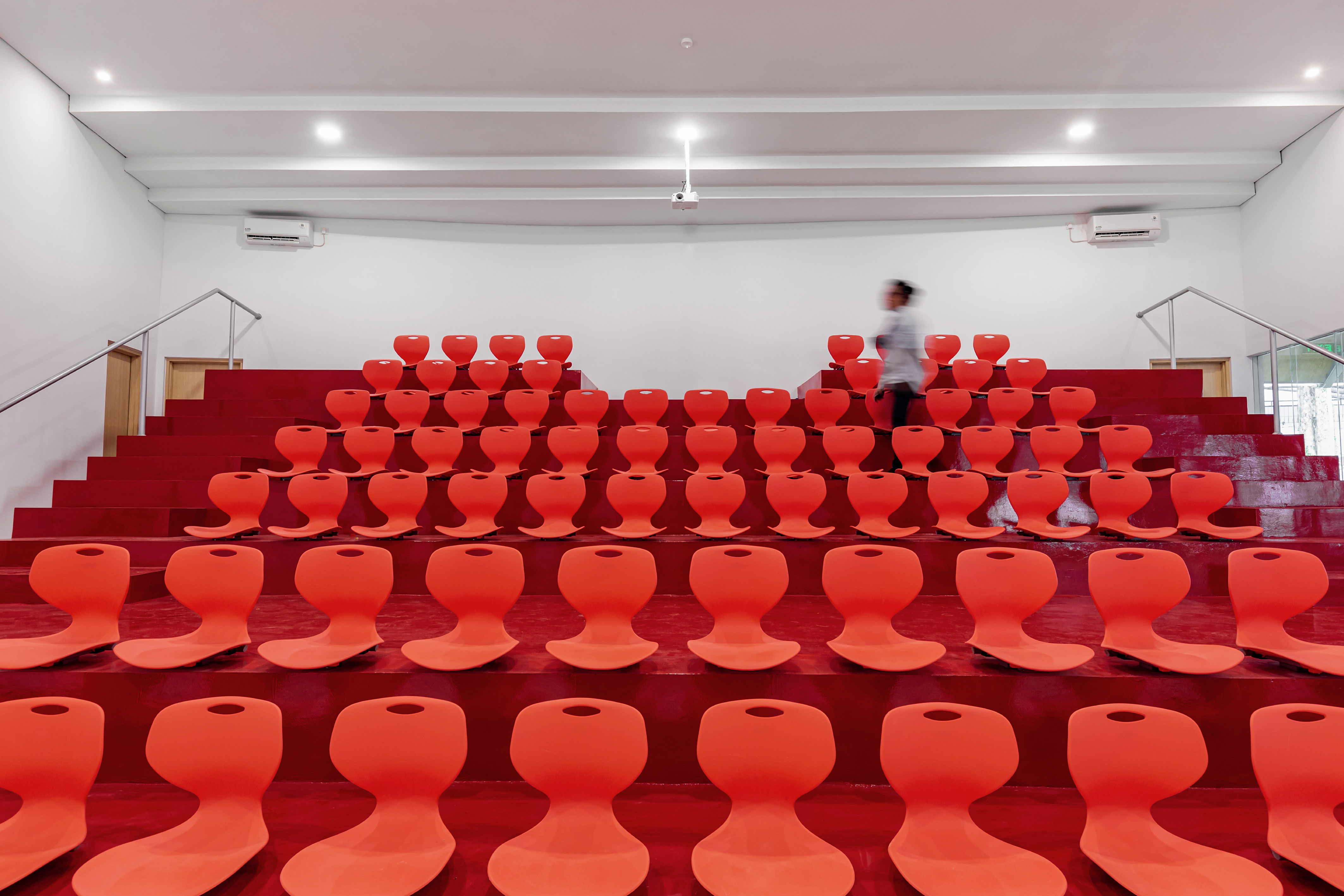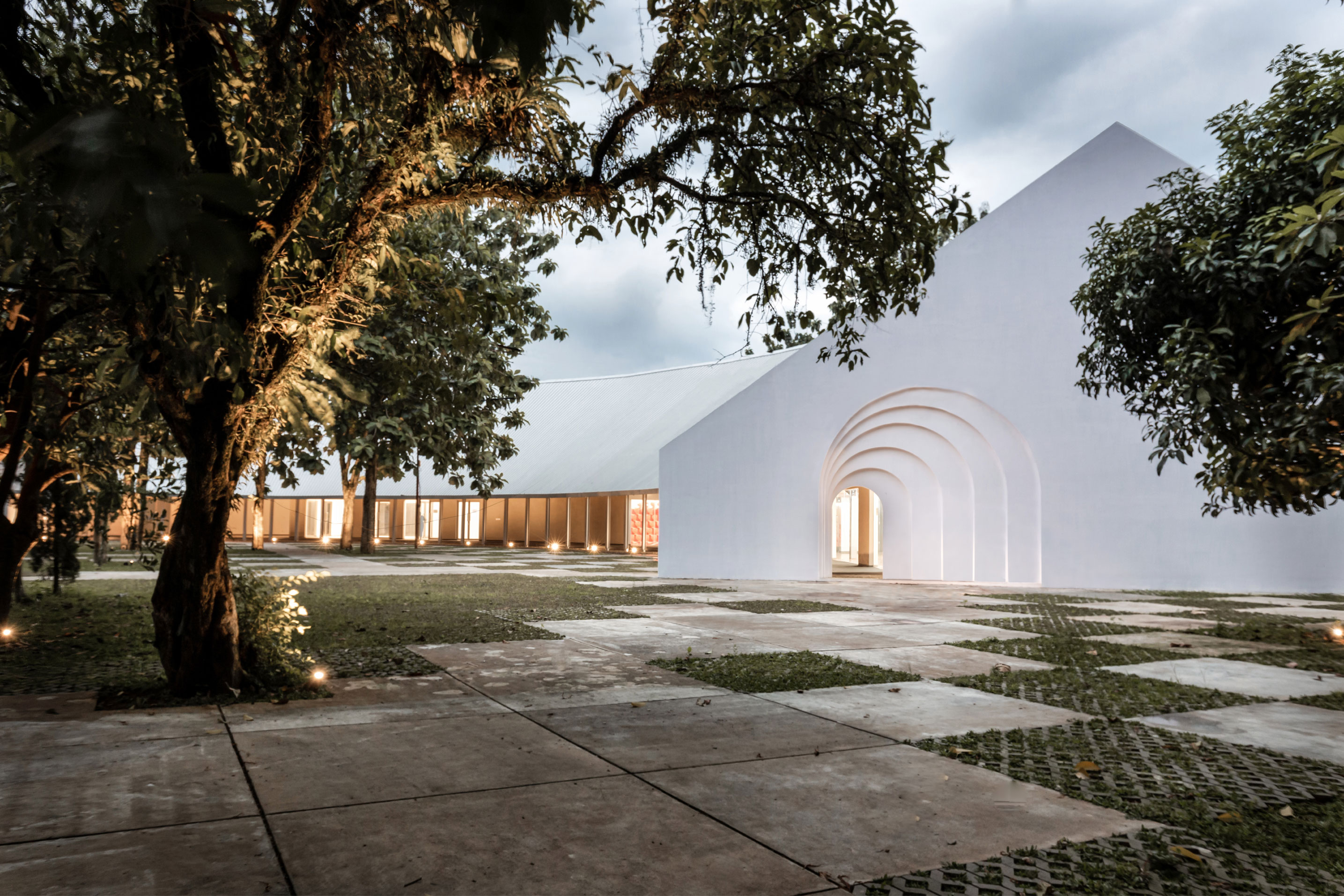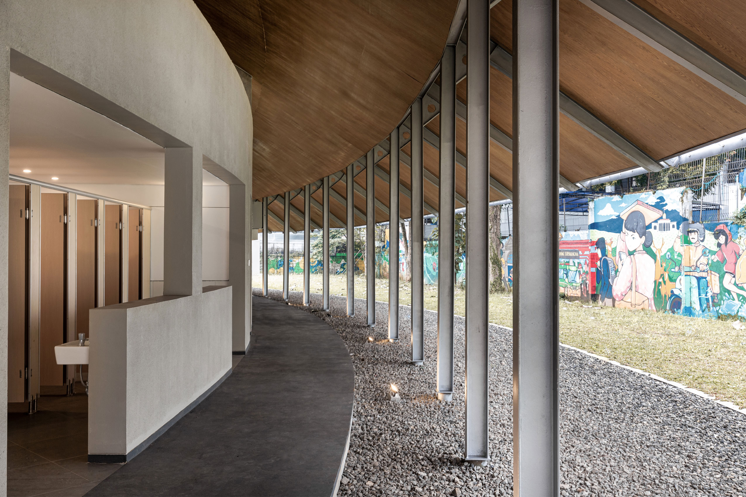 Designed as generator for creative people in Bogor, this creative hub aims as a collective space of activities that acts as an open platform for exchange, spontaneous, informal exercise & inspiring spaces. This building stands in 1.3 Ha land with 200 years old existing building built by Dutch colonial time, leaves an open space that can be utilized as casual and extension activity. This complex extends to larger neighborhood of Taman Hutan Raya Bogor of the Presidential Palace of Indonesia, making it very prominent yet carefully thoughtful in design language. The Creative hub is conceived as a single building, with porous accessibility from all directions, smoothly connecting all open space in the complex for open-air activities & extends to the park. The C form is organized by facing existing big trees & old buildings like it’s covering & filling out the edge of the complex. The programs inside (auditorium – classrooms – Gallery) occupy different geometries under a single curvy roof that reflects as a dominant expression of tropical design. All programs are surrounded by open terraces that enlarge the space as communal space and accessibility. The experience throughout the building takes visitors to repetitive columns, combining terraces within the inside-out area to the park. The sensation of covered open space continues through the terrace, providing an inclusive environment between education, leisure & outdoor performance. The building itself leaves room within the scheme, such as outdoor plaza to historical building, and to breed creativity through a social, informal space and dedicated programs.