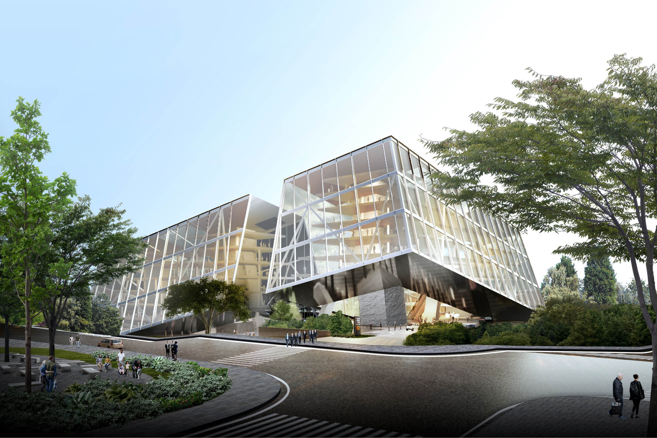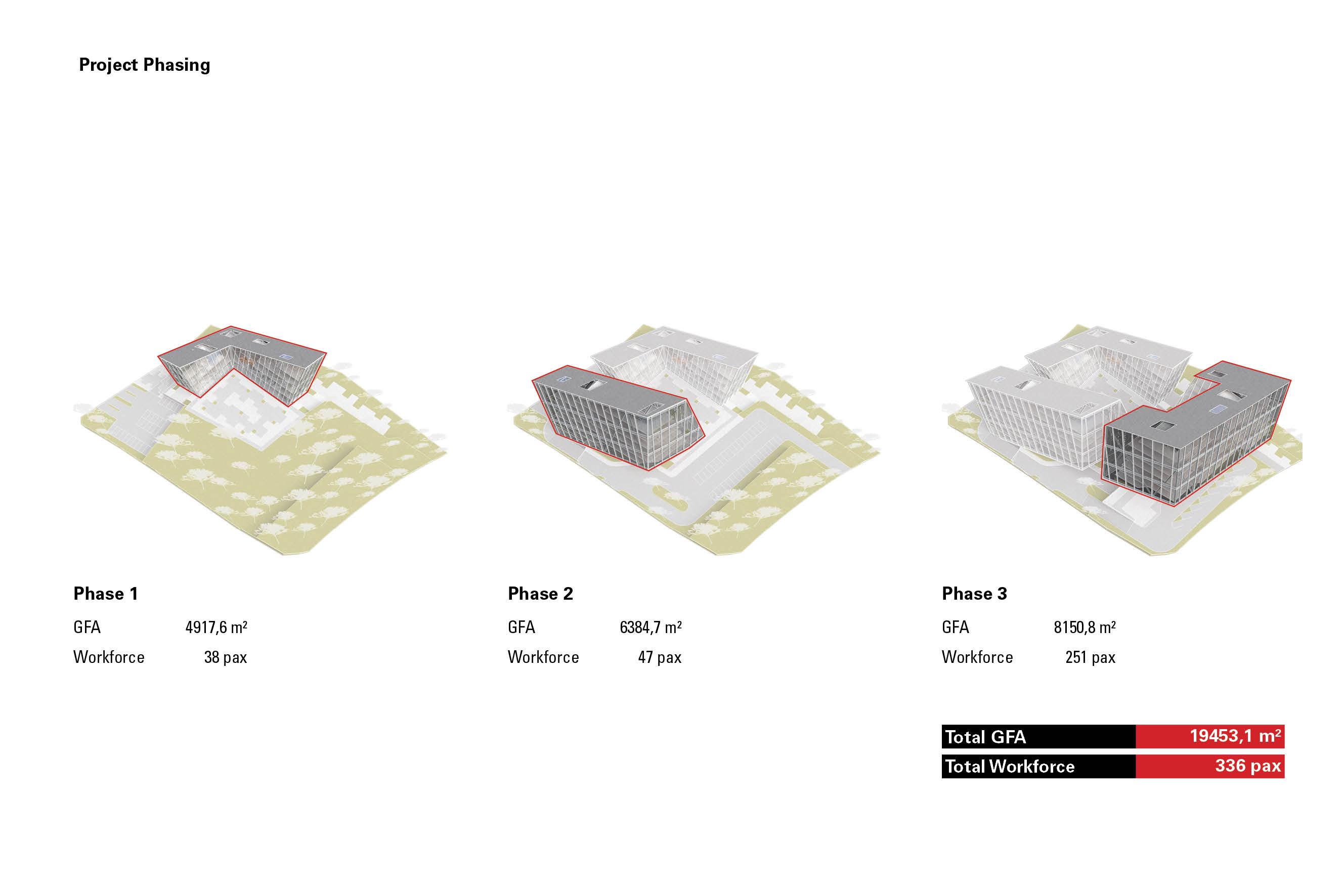 The massing is conceived as a playful interpretation of a simple box dropped on the site, resulting in a tilted shape contextual to the land's naturally sloping plot. This basic form is then hollowed out in the middle to create an inner courtyard for morning assembly while the building mass itself is divided into segments to signify the three phases of construction. Despite the tilted walls and ceilings, floor slabs are established parallel to the ground as normal, resulting in a terraced layout that makes for an unusual office typology with inter-level visual connectivity.