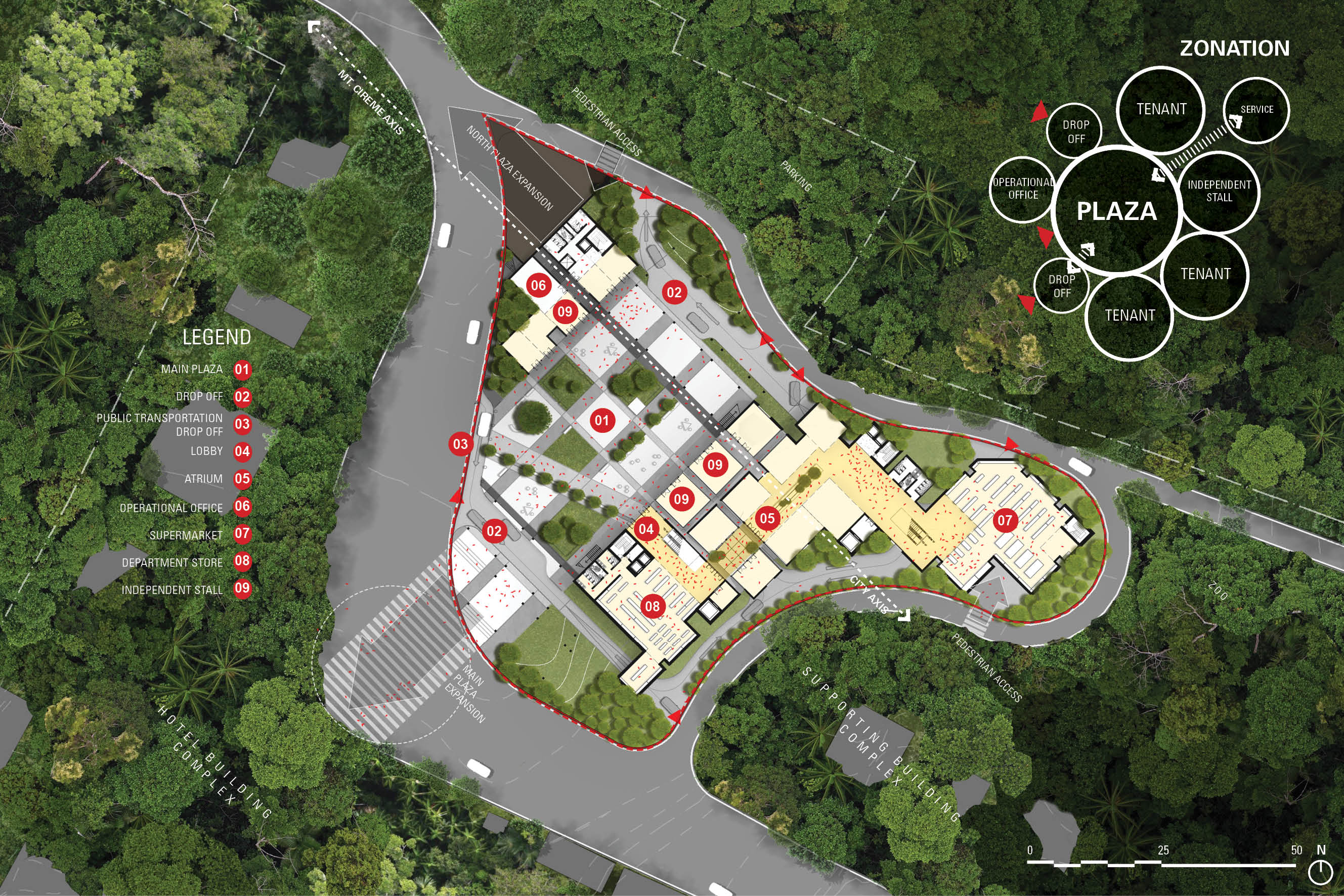 Interlinked footpaths and alleys are envisaged out of contextual grid strands, framing the main axis that is the Public Plaza with permeable circulation path which connects pedestrian access, the retail district within the site, and the forestry enclosing the area. Vehicle circulation is restricted to designated points of the shopping complex, allowing easy access to the area while also protecting the development as a car-free haven for pedestrians.