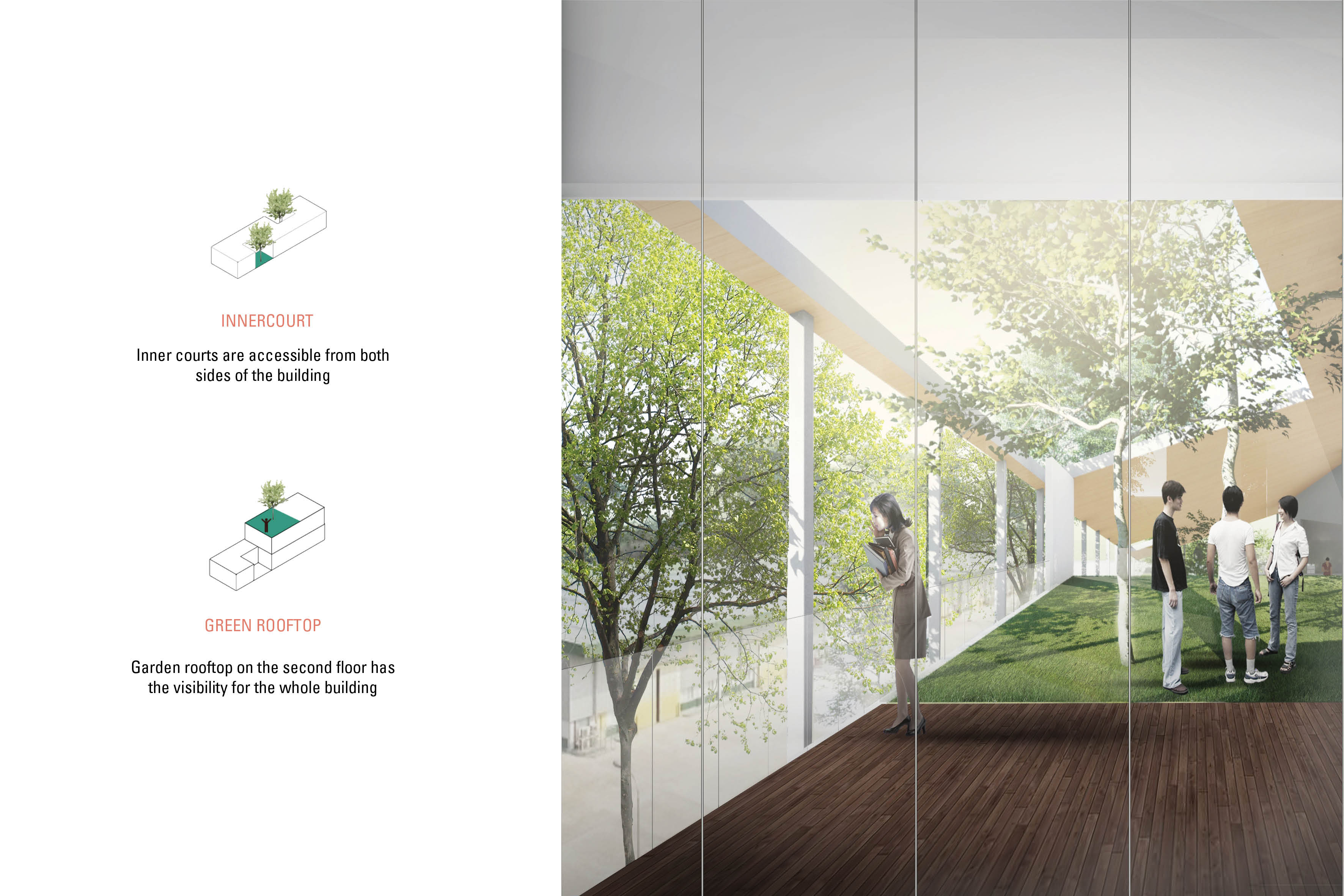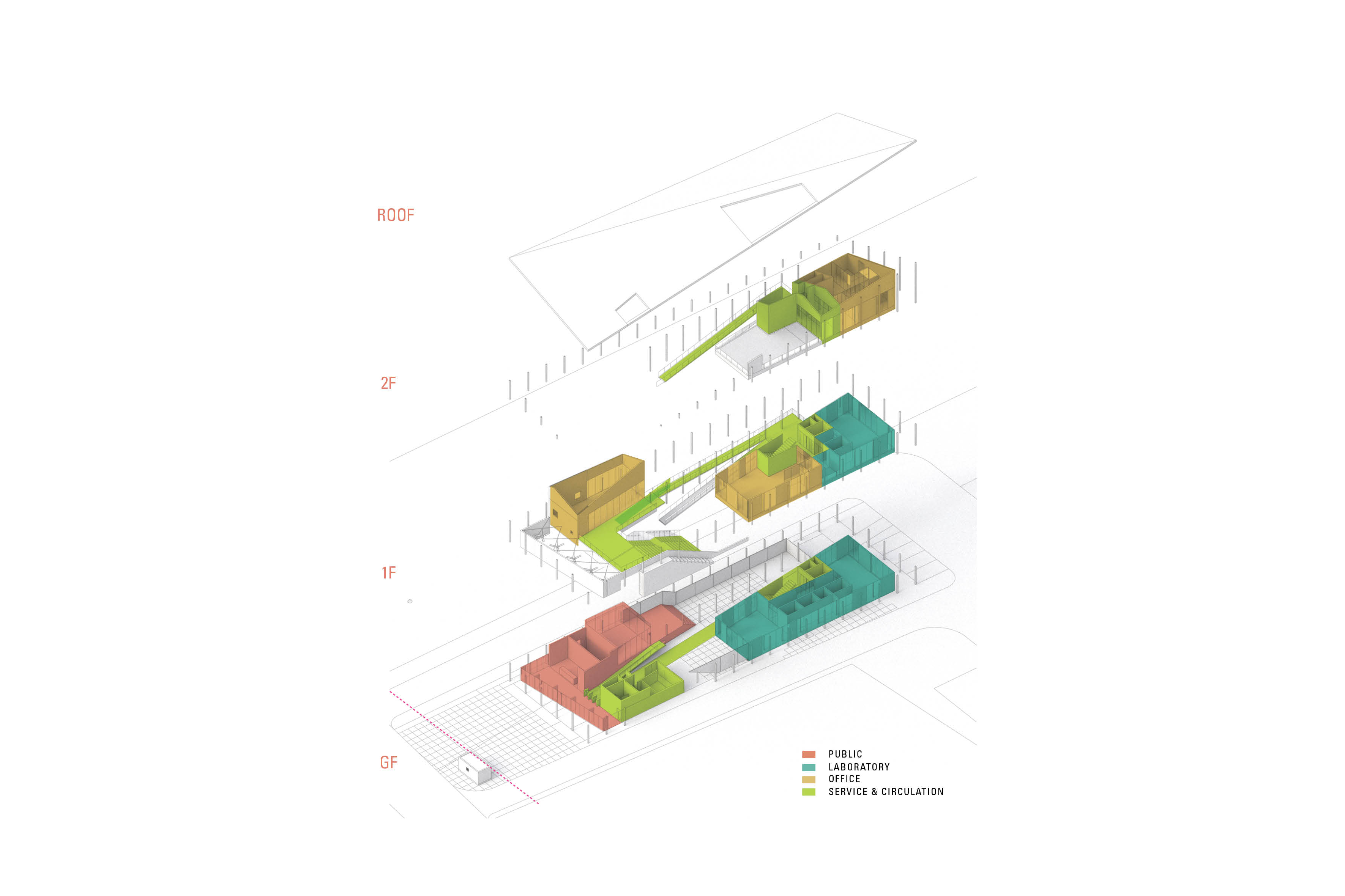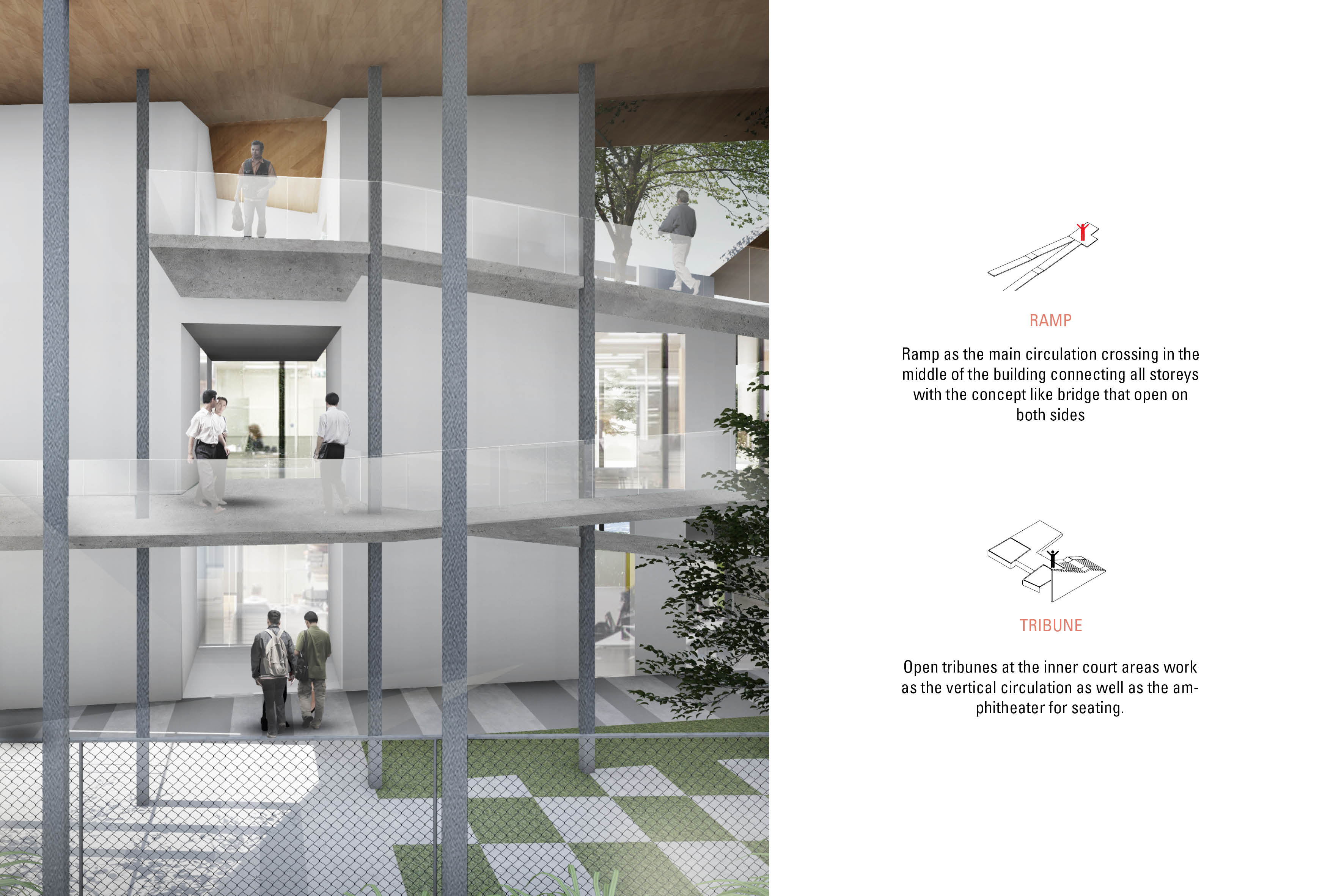 Divided into two zones, the building accommodates activities requiring efficiency, effectiveness, and security through its designated formal zones while the informal zone addresses public functions accessible to both staff and general public. Rooms inside the building are designed to be lax, blending the indoor-outdoor experience through the addition of inner courts and green rooftops and minimal wall intervention. A series of interconnected ramps and tribune acts as an open-ended bridge for the three building levels and makes up the main circulation of the building to provide a unique walking experience, whereas stairs and elevators are reserved for select functions that may necessitate efficient movement such as the office and laboratory.